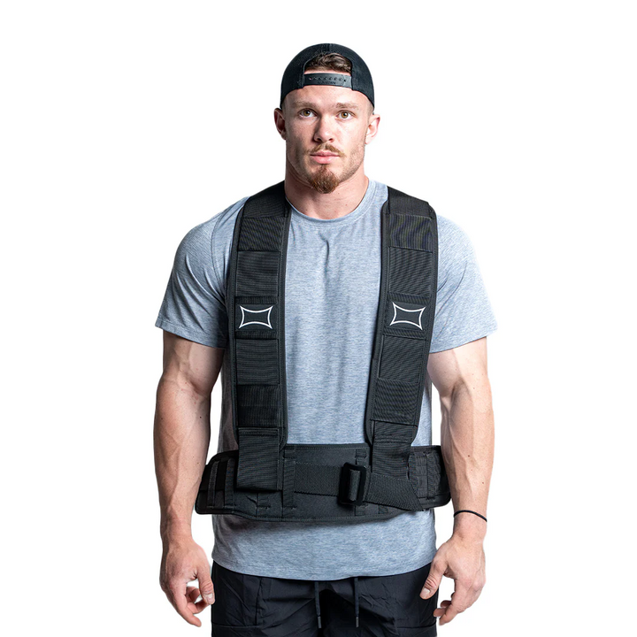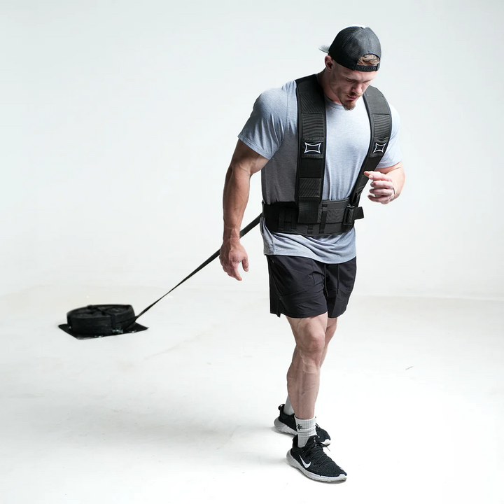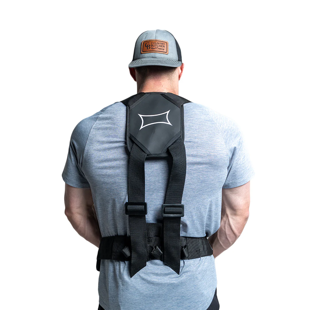 Use this upper body harness to drag/pull a sled using more of your upper body. This harness is a more comfortable way to use a sled (as opposed to a belt) by shifting the pressure off your waist and stomach. It allows you to drag the sled in multiple forward body positions by allowing you to lean at greater angles than a traditional belt.