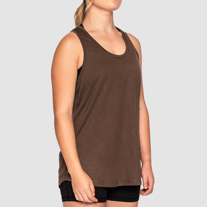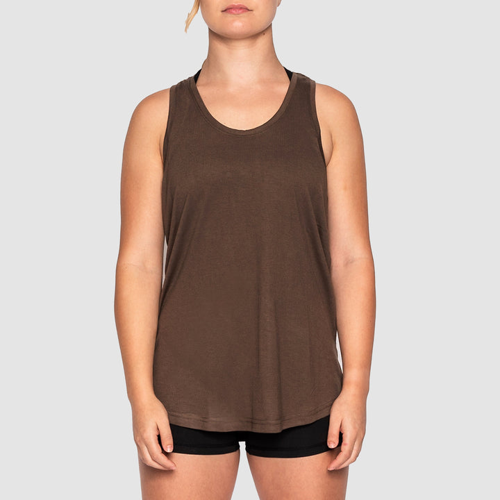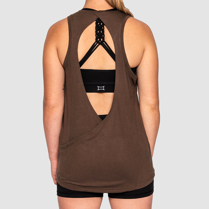 This breezy tank top is perfect to layer over your favorite activewear. It features an overlay design and a cutout on the back.