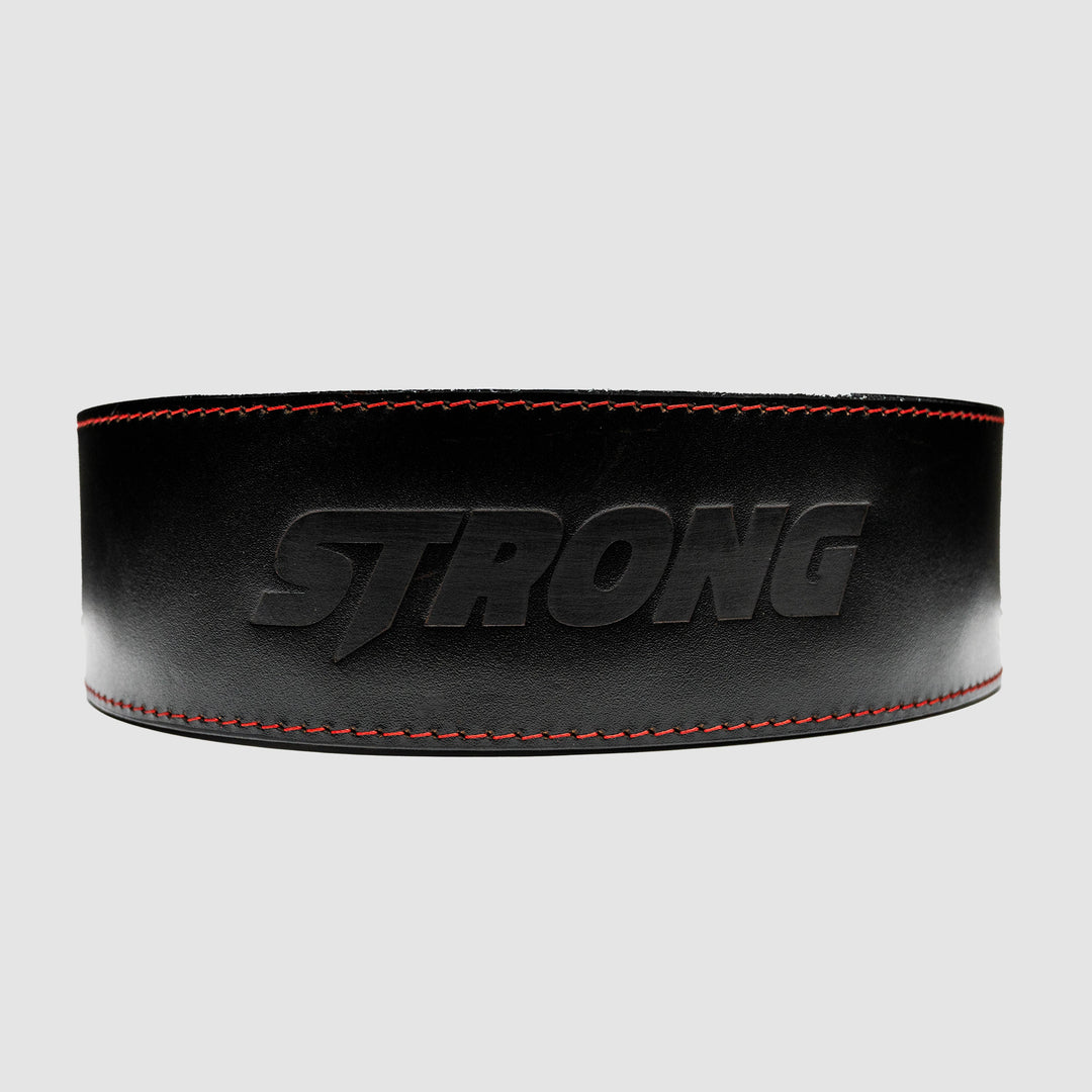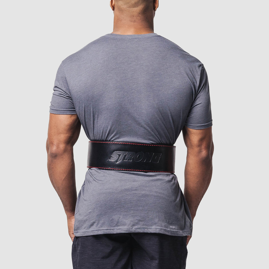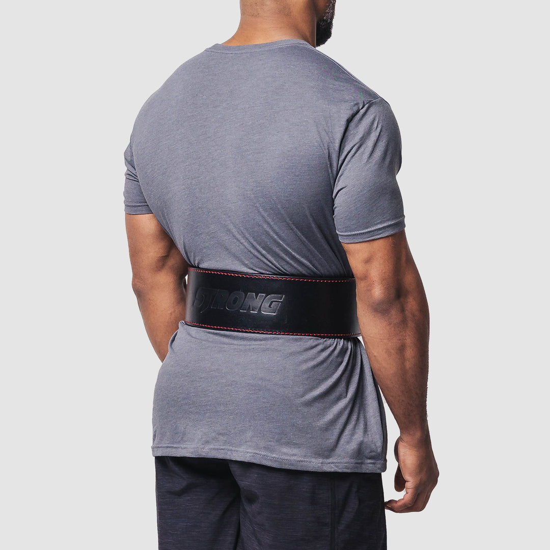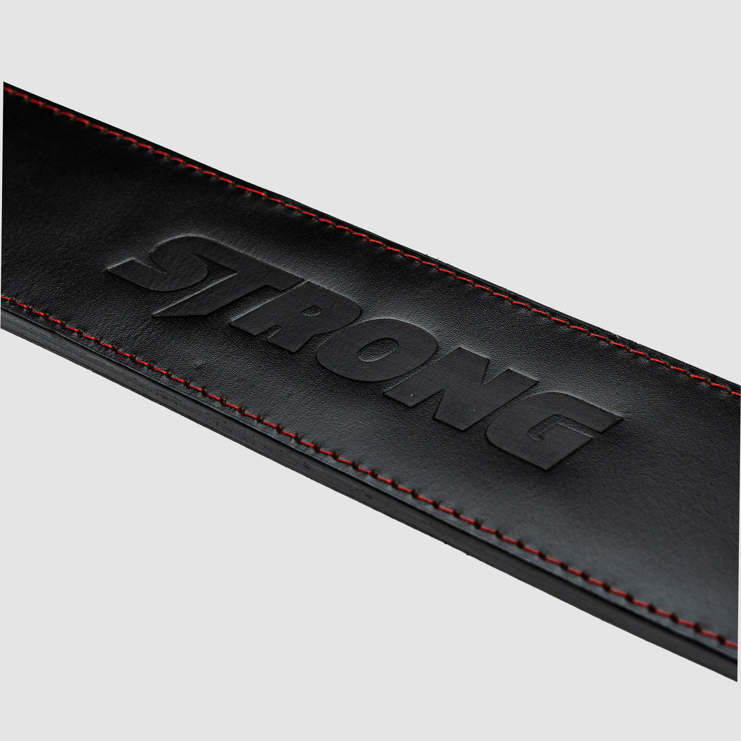 The Strong Lever Belt is one of the strongest and most comfortable lever belts on the market. Made from 100% genuine sole leather, The Strong Lever Belt is a firm, ultra-durable, water-resistant leather belt made to conform to your body and protect you when lifting heavy. Sleek aesthetic features a black lever on a black belt with red stitching and a debossed Strong logo.