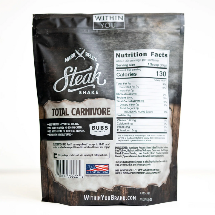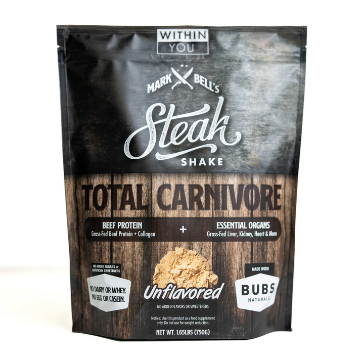 Unflavoured Total Carnivore Protein is a great tasting, animal-based protein powder made with high-quality Beef isolate protein, Beef tallow, Bubs Hydrolyzed Beef collagen, and 5 Beef organs. This one-of-a-kind protein contains No Whey, No Egg, No Dairy, No Casein, No artificial sweeteners or flavours...No junk! It’s great for elimination diets or anyone trying to stay carnivore!